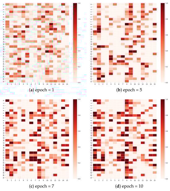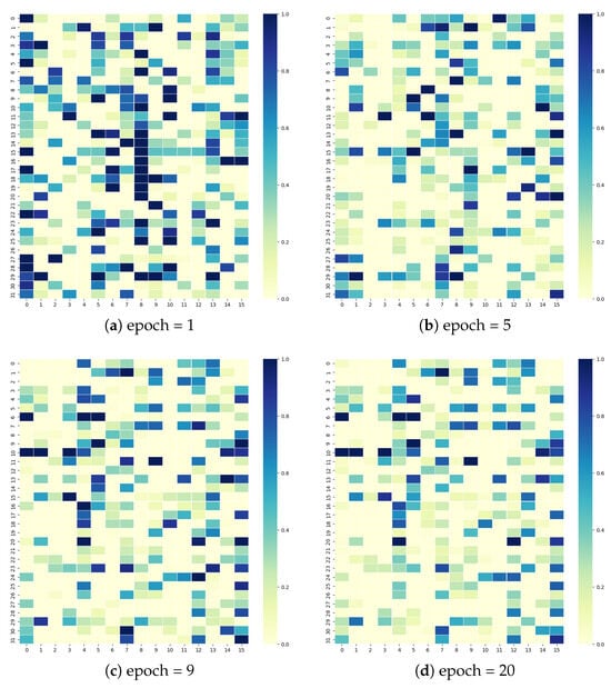 The distribution of dark color blocks in the attention heatmap is further changed. At this time, the darkest area is different from that at the beginning of the training, which shows that during the training process, the model has achieved noise reduction, reducing the weights of correlations in the noisy part and enhancing the weights of favorable high-correlation feature vectors. Finally, when the number of iterations reaches 20, the model’s accuracy no longer increases but shows a downward trend. In the attention heatmap, the shape of the dark areas has not changed compared with the best performance, but the number of dark color blocks has been further reduced on the original basis. This causes the model to perform excessive noise reduction operations, increasing the unnecessary complexity of the model and resulting in the phenomenon of model overfitting.