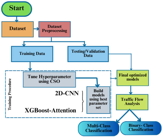 - Metaheuristic-based parameter tuning algorithm: We introduce and apply the Cat Swarm Optimization (CSO) Algorithm for the optimization of the baseline 2DCNN and XGBoost models. The strategy involves fine-tuning the convolutional neural network (CNN) and the XGBoost algorithm, which have been developed for binary and multiclass classifications, thereby improving the model’s ability to adapt to network conditions dynamically. The adaptive selection and fine-tuning of traffic patterns and hyperparameters enable the model to maintain high detection accuracy and adaptability in the dynamic 5G/6G environment. In addition to improving model performance, the CSO algorithm optimization process significantly improves model performance, as demonstrated in numerous tests.