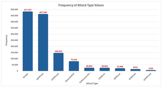 Various new connections, features, and services have been introduced in mobile communication networks with the advent of 5G technology. This study draws upon the valuable “5G-NIDD”, a comprehensive network intrusion detection dataset generated for the “5G wireless network”. This dataset, accessible through IEEE (access: https://doi.org/10.21227/xtep-hv36), has more than 1,215,890 samples, as given in Table 4. To our knowledge, this is the first publicly available 5G IDS data collection [52]. “5G-NIDD” emerges as a fully labeled dataset, a product of a functional 5G test network at the University of Oulu, Finland. Two base stations, each housing an attacker node and benign 5G users, orchestrate scenarios mimicking real-world threats. The attacker nodes initiate DoS attacks and port scans on a server deployed in the 5GTN MEC (accessed 6 August 2014, https://5gtnf.fi/). DoS attacks are shown in Table 5. Figure 2 provides an overview of recorded events, showing that the majority, with a count of 477,737, refers to “Benign Traffic”, which is the regular, expected, and harmless traffic within a network. Subsequently, the UDPFlood attack type emerges with a count of 457,340, followed by HTTPFlood with 140,812 occurrences.