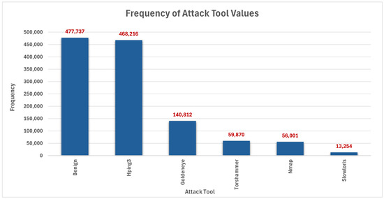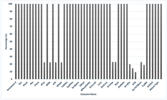 Moving on to identify the main tools used in the recorded activities, Figure 3 highlights the high proportion of typical cases, which account for 477,737 instances. However, the “Hping3” tool stands out as the most frequently used in attacks, registering 468,216 occurrences, followed by “Goldeneye” with 140,812 instances. An examination of missing values, depicted in Figure 4, highlights specific columns, such as “dTos”, “dTtl”, and “dHops”, with percentages amounting to only 77% of the total column values. To address this, we decided to discard these columns, ensuring a cleaner dataset.