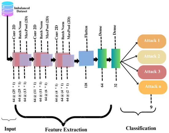 The 2D feature maps are then converted into 1D vectors by a flattening operation following the convolutional layers.The purpose of this transformation is to convert all the elements in the feature map into a single vector using a fully connected layer:The IDS’s performance is significantly influenced by the features chosen and designed. A thoughtful approach to feature development and feature selection is crucial to achieving the best results. To obtain high-quality information from X-rays and CT scans, a pretrained CNN model was used with a proposed 16-layer CNN architecture. Consequently, the eight convolution layers that comprise the basic CNN model are utilized to extract features. Following data preprocessing, the next crucial step is to train the model using state-of-the-art techniques. The objective of this study was to present a “single yet simple” model for multilabel attack types. As shown in Figure 5, the proposed CNN model is broken down into layers. The model was trained using just 16 batches of training and 100 epochs in total. The current technique was tested with several inputs, yielding encouraging results. The 2D-CNN architecture was trained on a total of 36,553 params (142.79 KB), 36,169 trainable parameters (141.29 KB), and 384 non-trainable parameters (1.50 KB).The expected architecture produced the expected outcomes for the provided collection of input features.A correlation analysis, denoted by C, is used to measure the linear relationship between two variables, as shown in Equation (14). By applying an identity matrix-based calculation, Equation (15) improves the evaluation of correlations and extracts their characteristics. The importance-weighted correlation coefficient is defined asA random integer between 0 and 1 is designated by in this case. - Output layer: To facilitate the multiclass classification task, a softmax activation function is used for the “main_output” layer as follows:This layer completes the model architecture by aligning nine units to the dataset’s classes.
