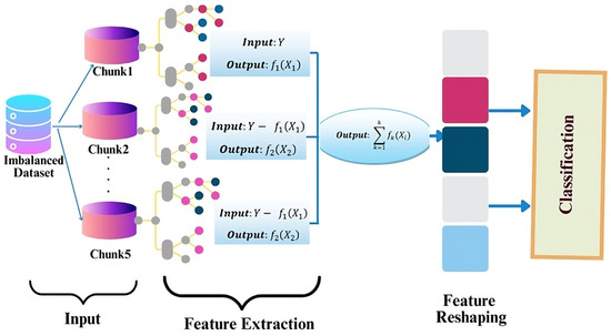 In the context of intrusion detection systems (IDSs) for wireless networks, an ensemble learning approach can be employed by sequentially generating detection models. Initially, all features related to network traffic are assigned weights and passed through the first detection model, which attempts to identify potential threats (as shown in Figure 6). The features that this model misclassifies are given higher weights, allowing the subsequent model to focus on these complex cases. Combining the results of multiple detection models enables the IDS to achieve more accurate and reliable threat detection.