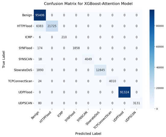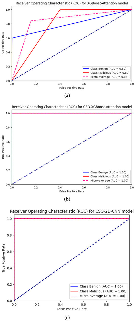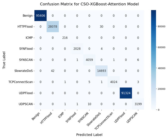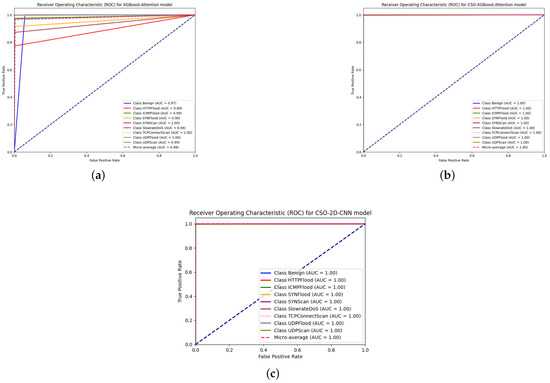 According to Table 9, the devised models performed well across various data distributions, achieving 100% accuracy in most cases. A detailed examination of confusion matrices for each class, shown in Figure 9, Figure 10 and Figure 11, enhances our understanding of the model’s performance. The model demonstrated resilience even with classes characterized by a limited number of samples, such as ICMPFlood, providing evidence of its adaptability to varying data distributions. Using the Cat Swarm Optimization (CSO) algorithm, the optimization process applied to the attention model significantly enhanced its predictive performance. As shown in Figure 12, the non-optimized ensemble of traditional XGBoost with the attention neural network has a marginally lower AUC of 89% for HTTPFlood compared to the other scenarios. HTTPFlood DoS attacks differ from others regarding packet volume and speed, making detection more challenging due to the slow transmission rate.