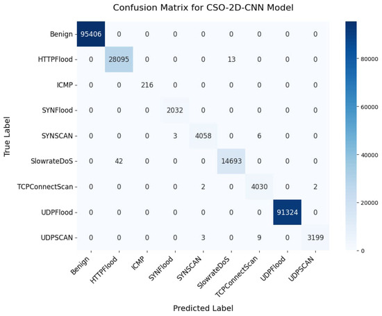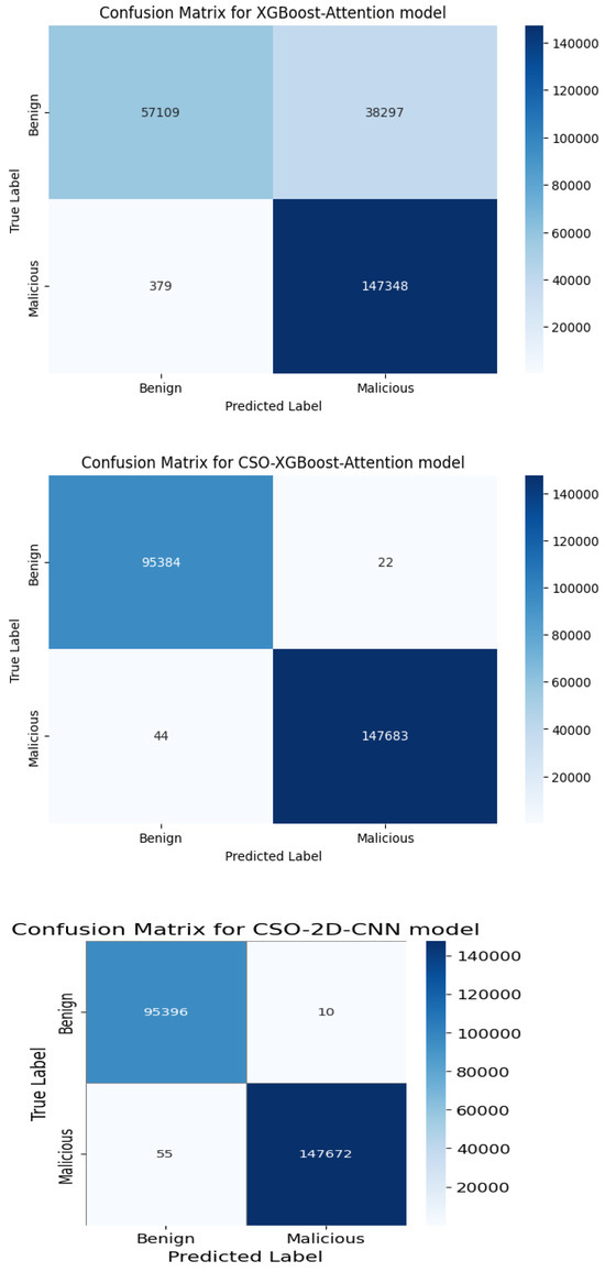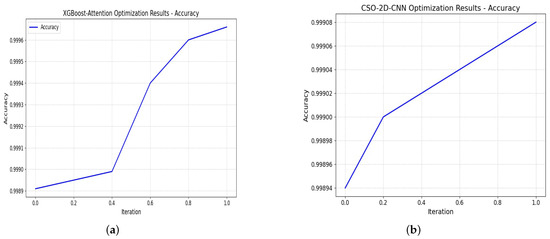 A deep learning model’s efficacy depends on accurately classifying data. Class-wise predictions provide insights into potential challenges and successful outcomes in classification. The CSO-2D-CNN model demonstrated exceptional accuracy, achieving 99.97% in the first experiment for multiclass classification (as summarized in Table 8), which highlights its ability to categorize instances across diverse classes within the dataset. Similarly, the CSO-XGBoost-Attention model exhibited a high accuracy of 99.95%. The accuracy of both models, with a maximum of 99.95%, demonstrates their reliability and effectiveness in accurately predicting cyberattacks. The end-to-end training of the 2D-CNN model allows it to map high-dimensional inputs directly to outputs, eliminating the need for additional feature extraction or selection. In contrast, traditional machine learning (ML) models, such as XGBoost, may struggle to represent complex patterns and structures.