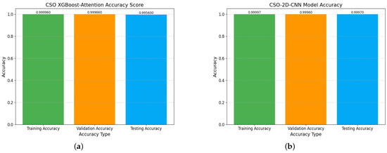 An intrusion detection system may be unable to distinguish between different types of attack, each of which may exhibit unique patterns, behaviors, and effects on the network if it simply classifies traffic as malicious or benign. Efficiency metrics, as described in Table 10 and Table 11, provide insight into the model’s robustness in the binary classes within the dataset. This emphasizes its adaptability to varying data distributions, a critical attribute for real-world applicability. Additionally, the optimization improved other performance indicators, such as precision, recall, F1-score, and Kappa score, indicating a more robust and effective predictive maintenance system. Figure 17 and Figure 18 offer a visual representation of the accuracy values obtained from the CS-2D-CNN and ensemble models. Non-optimized XGBoost-attention models achieve a maximum accuracy 80% in distinguishing between positive and negative cases in an imbalanced dataset. In contrast, the optimized models perfectly differentiate between positive and negative cases, demonstrating their ability to learn intricate patterns and generalize to previously unseen data. This indicates that the CSO-2D-CNN and CSO XGBoost-attention-based models memorize the training data and apply their learning to new, unknown instances, which is crucial for real-world applications.