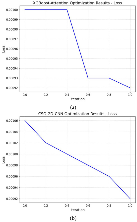 The convergence plot, depicted in Figure 13 and Figure 14, visually encapsulates the progression of the optimization process. The process illustrates the algorithm’s iterative refinement, resulting in a solution that aligns closely with the optimal value. This convergence indicates that the algorithm has successfully navigated the search space to find an optimal solution. The ensemble model, combining XGBoost and attention models, initially demonstrated a commendable accuracy of 96.47%, showing its effectiveness in classifying the data. The performance of the attention-based XGBoost model was significantly enhanced by using Cat Swarm Optimization (CSO) to adjust its hyperparameters, resulting in an accuracy of 99.96% (Figure 15). CSO’s ability to efficiently explore the hyperparameter space and identify optimal configurations contributed to this improvement. The optimal fitness score of the multilabel attention-based XGBoost model is 0.389, where a lower fitness score typically indicates a better configuration. As a result, the improved Attention-XGBoost model can generate precise predictions across a wide range of labels while achieving a high fitness level in hyperparameters. This increase in accuracy illustrates how the CSO approach has enhanced the model’s generalization ability and performance on challenging tasks. Figure 16 analyzes the model’s loss. The model’s ability to achieve high accuracy and minimal loss values during the training and testing phases substantiates its robust generalization capabilities. An accuracy level of 99.97% and a minimal loss function value of 0.00075 demonstrate the importance of hyperparameter optimization in optimizing machine learning models.