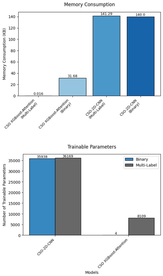 The number of parameters that can be trained is a critical concern when using a lightweight model. Training parameters refer to variables that can be adjusted during training. The parameters in a neural network consist of biases and weights for each layer. Using CSO-based selection procedures, the number of trainable parameters for each model is lower than when using random methods (Figure 19). This substantial improvement highlights the impact of optimization on the model’s performance, as the refined attention model contributed to more accurate and reliable predictions. The 2D-CNN model, after hybridization with CSO, required significant memory allocation to train it on benign vs. malicious traffic or multilabel attacks over two epochs, consisting of two main iterations and 40 subiterations. In contrast, with the incremental training methodology and data chunking, the ensemble model, which used decision trees, completed the process using approximately 31 KB of memory for multiclass classification across five epochs. Decision trees require fewer trainable parameters than CNNs, as they are less computationally complex. A decision tree-based model offers a straightforward and effective training method, particularly for handling unbalanced data, which can be challenging for CNNs. In contrast, the forward propagation of CNNs generates multiple feature maps, also known as activations, at each convolutional layer. These feature maps, which are stored in memory for backpropagation, represent the results of every filter applied to the input data. This process may lead to higher memory consumption during training. An essential technique for training CNNs is mini-batch gradient descent, which involves processing multiple samples concurrently in batches. For future work, we plan to apply the mini-batch procedure to test the effectiveness of the developed CSO 2D-CNN approach over different batch sizes, evaluating how it stores data, gradients, and intermediate activations for each sample in a batch. Additionally, while the proposed framework was assessed using one of the most enormous single-center datasets available, a significant limitation is its lack of validation across multiple datasets, which is crucial for generalizing the findings. To achieve better generalization, incorporating a multicenter dataset is essential.