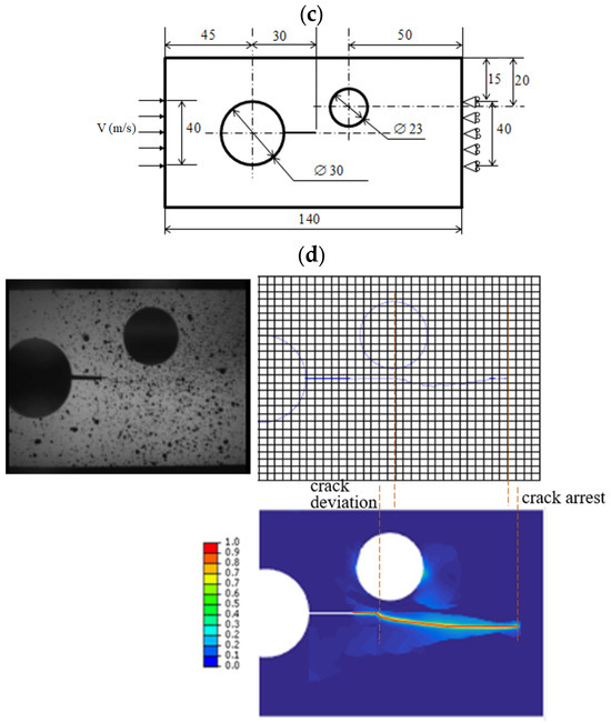 Tensile tests are conducted, incorporating both experimental and numerical analyses under quasi-static and dynamic loading conditions. A displacement load along the vertical direction is applied at the upper edge of the specimen, while a displacement constraint is applied at its lower right edge. The material parameters are as follows: Young’s modulus E = 250 KN/mm2, Poisson’s ratio ν = 0.3, and fracture toughness Gc = 0.003 KN/mm. Plane strain conditions were assumed in the numerical model. Figure 2 presents a comparison of the crack growth paths between numerical simulations and experimental results.
