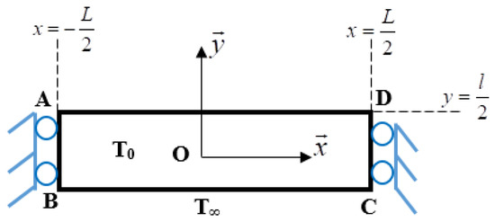 Furthermore, no boundary conditions are imposed on the damage field on the left and right sides, allowing it to evolve freely (Equation (16)). Regarding the initial conditions, the plate is considered to be at a uniform reference temperature, T0, ensuring it remains stress-free and undamaged.