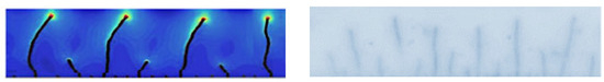 A ceramic plate of size 25 mm × 5 mm × 1 mm is heated to a temperature T0 equal to 500 °C. After that, the heated specimens are dropped into a cold-water bath of T∞ = 20 °C. We represent, in Figure 6, the damage field (α = 1) obtained by the numerical simulation of a ceramic material submitted to a thermal shock. We represent, in Figure 7, some different steps of the cracking process. The crack growth steps are summarized as follows:
