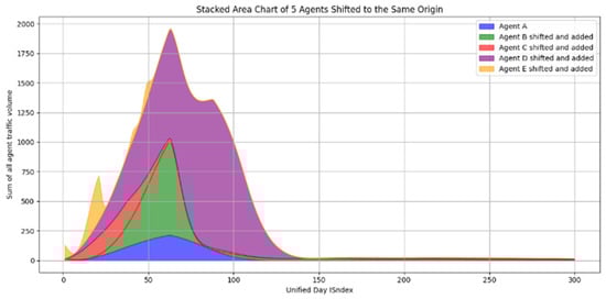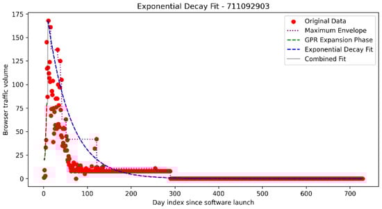The fact that the browsers have been selected from the same ecosystem makes them a good candidate for aggregation. Remapping them to day indices results in . As described in Section 4.3.1, this makes this aggregation possible, as is visually depicted in Figure 6. All reindexed and model fit progressions are stacked on top of each other to reach a unified model.