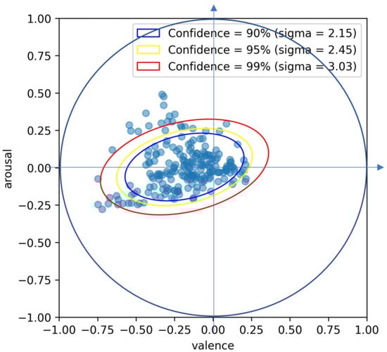 where T is the selected subset, h is the size of the selected T subset, represents the relevant data points, and is the mean of T. Select an initial subset and calculate the mean and covariance matrix based on it. Compute the Mahalanobis distance of each data point and select the data points with the closest distance to form a new subset, repeating and updating the process. The smaller the sample covariance matrix, the higher the correlation between the data points, and, finally, the subset with the minimum covariance matrix is selected. However, to address the problem of low computational efficiency on large datasets, we use Fast MCD [39]. Fast MCD computes the covariance matrix and Mahalanobis distance over multiple randomly selected subsets of the data. The process is repeated for each subset in parallel, and the subset with the smallest covariance matrix determinant is finally selected. This method reduces the impact of outliers in the data while providing a more accurate estimate of the variability in the data. Because of these properties, the confidence ellipses obtained using the MCD estimator provide boundaries that better reflect the true distribution of facial expression data. This process was used to determine the statistical distribution of the data, which led to the creation of 90%, 95%, and 99% confidence ellipses, which can be seen in Figure 2. Data points that fell within the ellipses were defined as facial expressions that reflected nervousness with a high probability, and this method provided an objective and accurate basis for identifying nervous facial expressions. While traditional models such as those proposed by Lang et al. [40] place anxiety-related states in the low-valence, high-arousal quadrant, the actual valence–arousal coordinates of these facial expressions tended to exhibit a distribution similar to that of neutral emotions. This discrepancy highlights the complex and context-dependent nature of nervousness.