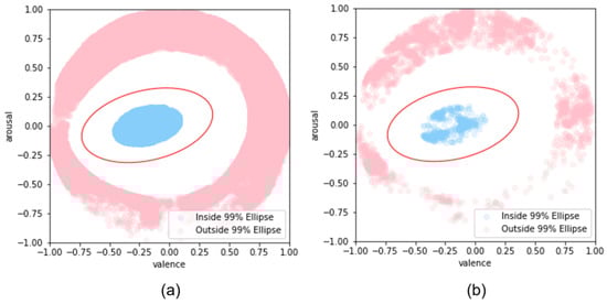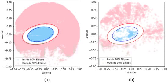 Distribution of AffectNet datasets based on defined confidence ellipses: (a) training dataset; (b) validation dataset.