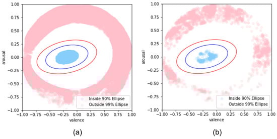 After labeling the data points inside the 90% confidence ellipse and outside the 99% confidence ellipse, we adjusted the values of valence and arousal, as shown in Figure 4. The resulting distributions can be seen in Figure 6.