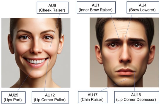 The Facial Action Coding System (FACS) defines 46 AUs that correspond to movements of specific facial muscles [7]. This system was developed by Ekman et al. and is used to anatomically analyze facial expressions. Each AU represents the movement of an independent facial muscle, which allows subtle changes in emotional expression to be detected. FACS covers different areas of the face; for example, the upper region of the face contains AU1 (inner brow raise) and AU6 (cheek raiser), which represent the movement of the eyebrows and cheeks. On the other hand, in the lower part of the face, AU15 (nose wrinkler) and AU23 (lip tighten) are located to describe the movement of the nose and lips.