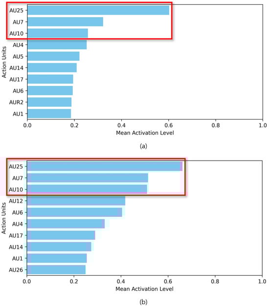 Average activation of action units for nervousness emotion. (a) Audition program participant dataset collected for nervousness; (b) AffectNet dataset filtered as nervousness.
