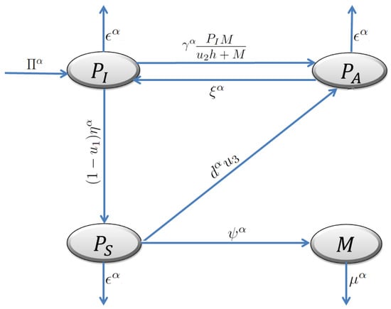 Schematic description of the transmission dynamics between FOM (3) compartments.