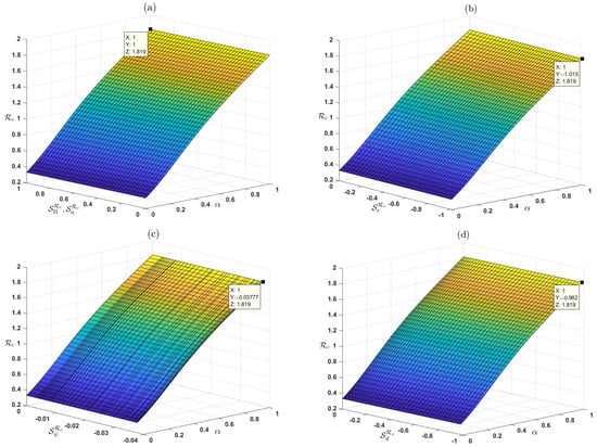This means that if the parameters and increase, then also increases, provided that all other factors stay unchanged. As a result, the rumor spreads on a larger scale. This indicates that the propagation of the rumor will be aided if gullible people accept the claims and spread them on their own. Next, we looked at the parameters , and d, from which we can obtain the sensitivity index. Moreover, the values of the sensitivity index with these parameters are presented in Table 1.