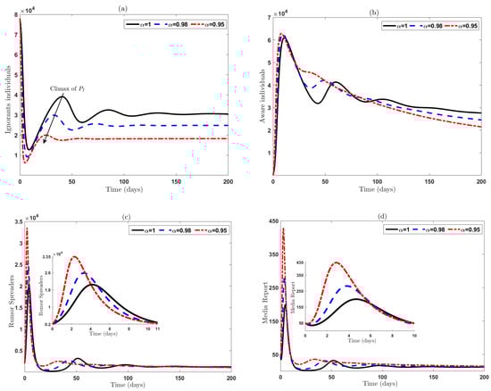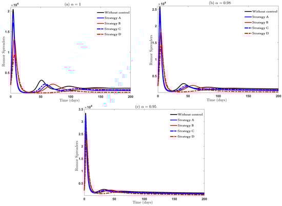 The behavior and impact of the four strategies on rumor spreading among individuals are presented in Figure 6. We observe that at the beginning of the rumor propagation period, the number of spreaders reaches its climax, but after applying control measures, the situation begins to stabilize, and the number of spreaders decreases dramatically until stability is achieved. It is also clear from Figure 6a that Strategy D most noticeably reduces the peak number of spreaders, on the contrary, while Strategy A and Strategy C have a higher peak number of spreaders than the other strategies. The fractional order impact on rumor spreaders is displayed in Figure 6b,c. We conclude that not paying attention to the communication of rumor spreaders with ignorant people (i.e., ) and not controlling rumor spreaders (i.e., ) leads to an increase in rumors among individuals, as evident in Strategy A and Strategy C, respectively.