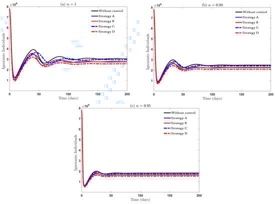 In Figure 4, we compare the effects of strategies A, B, C, and D, as well as the case without controls on the ignorant population with , and in Figure 4a, Figure 4b and Figure 4c, respectively. As can be seen from Figure 4a, all strategies have a significant impact in reducing the ignorant individuals in the first 10 days. However, the declining value of Strategy D is the largest and the declining value of Strategy A is the smallest compared with the uncontrolled case. In Figure 4b,c, we note that the fractional operator has a big effect on the behavior of the solution, where the value of the decrease is less than the integer case (i.e., ), and reaching stability is faster, as it is clear that the number of oscillations decreases as the value of decreases. We conclude that the absence of spreading the harmful effects of rumors and reducing the friction between rumor spreaders and those ignorant of it (i.e., ) gives an undesired result in reducing the number of individuals ignorant of rumors (i.e., Strategy A).