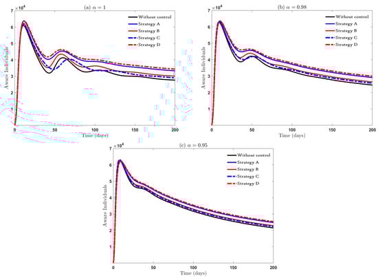 The impact of the proposed strategies on aware individuals is depicted in Figure 5. We note that all strategies work to increase the number of aware individuals to reach the peak in the first 20 days of the control intervention period, but there is a difference in the speed of reaching that peak, as the fastest strategy is Strategy D and Strategy B is the slowest. It is also clear from the Figure 5b,c that the effect of fractional order increases the speed of reaching the peak and the state of stability. The observation is that the absence of publishing correct media broadcasts to limit the negative effects of rumors (i.e., ) gives an unsatisfactory result in increasing the number of individuals aware of rumors in society (i.e., Strategy B).