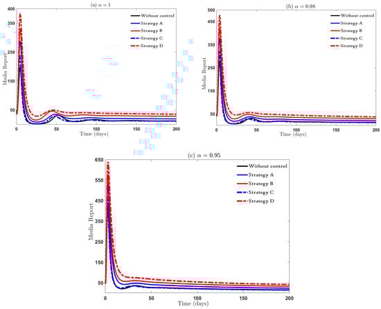 Figure 7 illustrates the trend of media reports under suggested control strategies and the scenario without control. Clearly, the number of media broadcasts is lower in controlled cases compared to uncontrolled cases under any strategy. Thus, the proposed measures help expand media coverage. However, Strategy D is most effective in increasing media reports, whereas Strategy C has the least impact among the proposed strategies. The effect of the fractional operator on the trend of media reports is also evident in Figure 7b,c. We find from the previous results that all strategies effectively reduce the spread of rumors, but their effects on the variables differ. Despite this, they unanimously suggest that Strategy D performs best across all variables and is the most effective in curbing rumor spread in society. Moreover, formulating the problem in a fractional context helps all model variables reach stability more quickly than with integer order models.