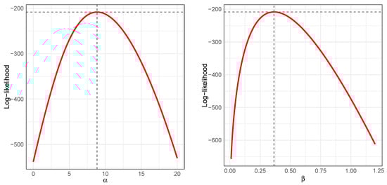 The system , defined by Equations (6)–(8), does not yield an explicit analytical solution. Consequently, numerical methods, such as the Newton–Raphson or quasi Newton–Raphson algorithm, are required to obtain the ML estimators (MLEs), denoted by . Alternatively, optimization techniques that directly maximize the log-likelihood function, for instance, the method proposed by MacDonald [], may also be employed.