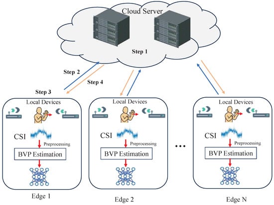 Prior to training, all BVP tensors v are normalized on a per-sample basis using min-max scaling, ensuring that the input values fall within the interval . For each communication round, every edge device performs 50 epochs of local training using its available data. The batch size is fixed at 256, and the learning rate is initialized at . All experiments are implemented in PyTorch 2.6 and executed on a computing platform equipped with an NVIDIA GeForce RTX 4090 GPU. Details regarding the dataset composition, preprocessing steps, and hyperparameter settings are summarized in Table 1.