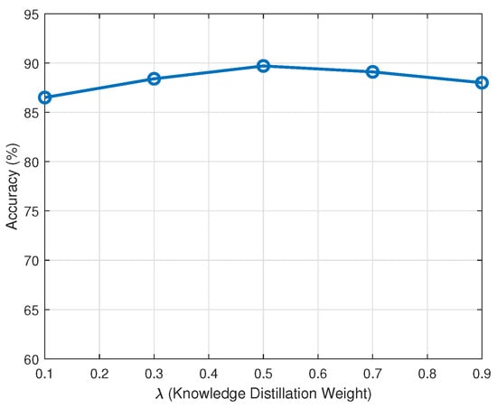 The parameter controls the influence of the teacher model during distillation. As shown in Figure 2, increasing from 0.1 to 0.5 improves accuracy by encouraging the edge models to better mimic the cloud (teacher) model. Beyond 0.5, the accuracy plateaus and slightly decreases, indicating that an over-reliance on the teacher model can reduce the edge model’s ability to adapt to local data nuances. Therefore, = 0.5 is an optimal trade-off point balancing generalization and local adaptation.
