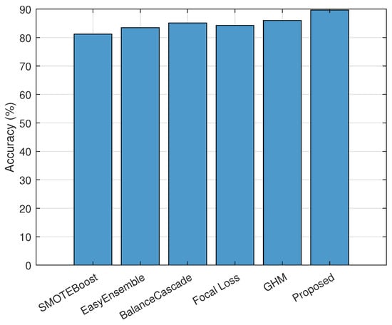 The classification performance across different learning approaches is evaluated. As illustrated in Figure 3, the proposed framework achieved an accuracy of 89.7%, outperforming all baselines. Traditional ensemble methods such as EasyEnsemble and BalanceCascade demonstrated moderate effectiveness due to their ability to handle class imbalance, while SMOTEBoost and focal Loss partially mitigated data skew. However, their performance was constrained by the absence of global coordination and compression-aware optimization. The superior accuracy of the proposed approach is attributed to its hierarchical optimization scheme, integrated model compression, and knowledge distillation components, which enhance generalization under imbalanced data distributions.