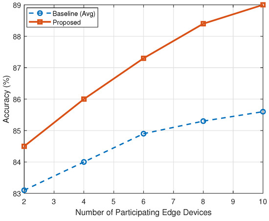 We also explored how the number of participating edge devices influences recognition performance. As shown in Figure 4, increasing the number of edge nodes resulted in consistent performance improvements for both the proposed method and the baseline. However, the proposed framework exhibited a steeper accuracy gain, reaching 89.0% with 10 participating devices, compared with 85.6% for the baseline. This suggests that the proposed method better exploits distributed data diversity, largely due to its federated aggregation mechanism and consistent knowledge transfer from the cloud model.