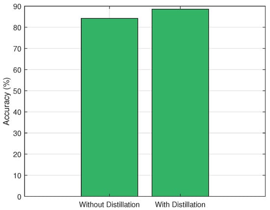 Additionally, the impact of knowledge distillation on model performance was assessed. As depicted in Figure 6, edge models trained without distillation achieved an accuracy of only 84.2%, whereas incorporating distillation from the cloud model improved performance to 88.6%. This 4.4% gain underscores the critical role of the teacher–student paradigm in enabling compact edge models to approximate the decision boundaries of more complex cloud models, thereby enhancing inference quality under resource constraints.