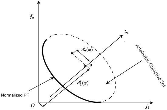 Illustrated in Figure 1, the normalized population features vector as the normalization vector, where the origin o represents the ideal point, and u denotes the projection of onto the reference vector . Let denote the distance between the ideal point o and u, while represents the perpendicular Euclidean distance from to . The precise definitions of and are outlined as follows: