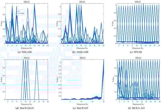 Parallel coordinate visualization of the non-dominated solutions from six algorithms on the 20-objective DTLZ2 problem.