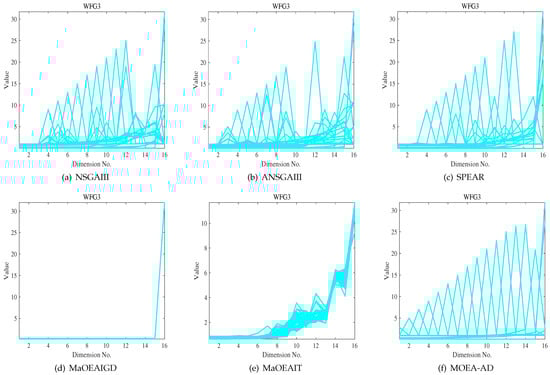 Parallel coordinate visualization of the non-dominated solutions from six algorithms on the 16-objective WFG3 problem.