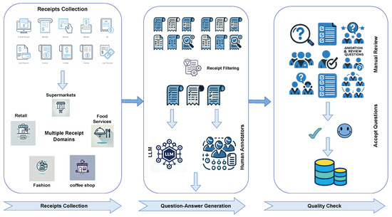 Our dataset construction pipeline consists of three stages. First, we collect receipt images from diverse domains, including retail, food services, supermarkets, fashion, and coffee shop sectors (Section 3.1.1). Second, we generate corresponding QA pairs using a combination of LLM and human annotators to ensure high-quality question–answer pairs (Section 3.1.2). Finally, we perform automated filtering followed by a manual review to validate the quality of the generated instances (Section 3.1.3).