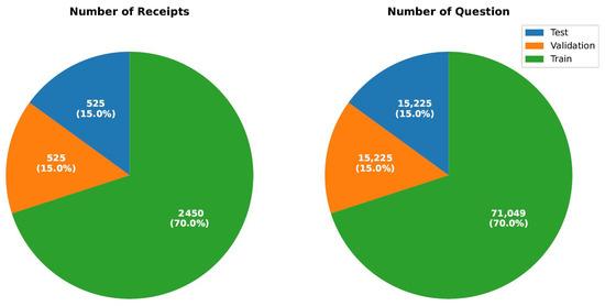 ReceiptQA comprises a total of 3500 receipt images paired with 171,935 question–answer pairs, spanning five diverse domains: retail, food services, supermarkets, fashion, and coffee shop. The dataset is split into two subsets: a human-annotated subset containing 101,935 questions and an LLM-generated (GPT-4o) subset contributing an additional 70,000 questions. The dataset is divided into three subsets: 70% of the dataset is allocated for training, consisting of 2450 receipts and 71,050 question–answer pairs, while 15% is used for validation, comprising 525 receipts and 15,225 question–answer pairs, and the remaining 15% is designated for testing, also consisting of 525 receipts and 15,225 question–answer pairs. Figure 3 illustrates the proportional distribution of receipts and question–answer pairs across the training, validation, and test sets, ensuring a balanced of receipt-based question-answering models.