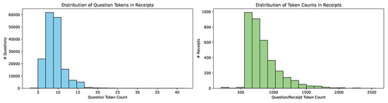 Token Analysis. Using the GPT tokenizer, we analyzed the token counts for questions and answers. Figure 6 illustrates the distribution of token counts across questions and receipts in the ReceiptQA dataset. The first plot shows the distribution of question token counts, with a range spanning from 3 to 42 tokens and an average of 8.84 tokens per question. The second plot presents the distribution of total token counts per receipt, encompassing both questions and answers. The token counts for receipts range from 4 to 1162, with an average of 8.34 tokens per answer.