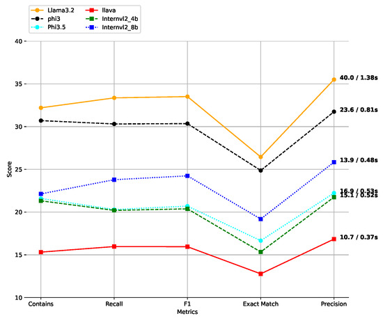 Figure 7 illustrates that LLaMA-3.2 achieves the best performance, with a precision of 35.50, F1 score of 33.51, and exact match of 26.45. However, this comes at the cost of efficiency, with a processing time of 1.38 s per receipt (40 ms per question).