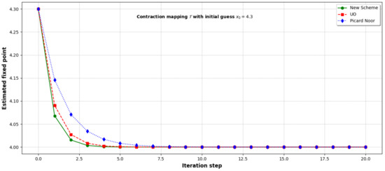 The Picard–Noor (3) and UO iterative schemes (4) have some of the fastest known convergence rates for contractive mappings. Therefore, they provide a strong benchmark for evaluating the efficiency of our new scheme. Our goal is to demonstrate that the new scheme is not only convergent but also superior in terms of convergence rate when compared with leading schemes.