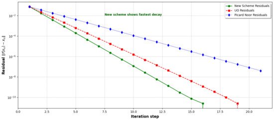 Therefore, is a contraction mapping on . The Banach contraction principle guarantees that there exists a unique fixed point, . Let for each and the initial point . We now compare the convergence rates of the new scheme, the UO, and the Picard–Noor.