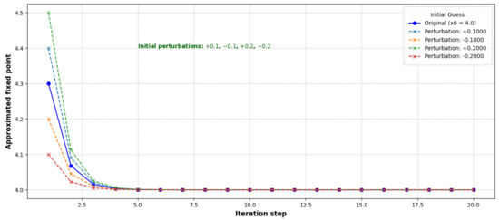 Figure 2 displays the residual norms at each step for all schemes. The residual represents the deviation between the image of the current iterate under the mapping and the iterate itself. The residual norm for the new scheme decreases more rapidly than for the other two schemes. This implies that for each iteration, the new method yields a better approximation of the fixed point. Such behavior is valuable in practical problems where reducing the number of iterations translates to saving computational resources. Furthermore, we consider Example 1 under slight perturbations of the initial guess. Specifically, we introduce perturbations of magnitude , , , and to the initial point and observe the behavior of the resulting sequences. Figure 3 shows that despite the initial deviations, all perturbed sequences converge rapidly to the same fixed point as the unperturbed sequence. This indicates that the effect of the perturbations diminishes progressively with each iteration, confirming the stability of the proposed scheme.