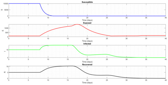 We consider a delayed epidemic model with four compartments: susceptible (), exposed (), infected (), and recovered () adopted from [25,26]. The SEIR model of the Ebola virus consists of coupled nonlinear delay differential equations that track how individuals move between compartments: