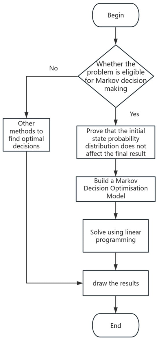Linear programming (LP) is a convex optimization method aimed at maximizing or minimizing a linear objective function subject to a set of linear constraints. This theory primarily relies on geometry and convex analysis [27]. Each constraint defines a region in high-dimensional space that can be transformed into a polytope, where one of the vertices of the polytope represents the optimal solution. The MDP reconstructed using linear programming provides a systematic approach to solving complex stochastic optimization problems. This method combines the framework of MDP with the techniques of LP. By transforming the decision-making process in MDP into a linear programming model, we can leverage established linear programming algorithms to obtain a globally optimal solution. This approach effectively handles randomness in dynamic environments while ensuring model flexibility. Furthermore, during the application of the reconstructed MDP, researchers can conduct a sensitivity analysis, which aids decision-makers in understanding the impact of different decision options and provides theoretical support for decision-making. The specific flowchart is shown in Figure 1 below.