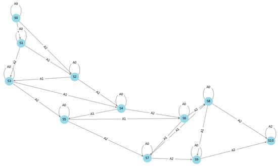 Markov decision processes (MDPs) provide process managers with effective tools for rapid analyses, which are critical for strategic planning and scenario assumptions in highly competitive markets [5]. First, MDPs have proven their utility in a variety of management domains, successfully addressing issues ranging from financial challenges to human processes and reliability [6,7,8]. Second, these models play a key role in process optimization, such as determining the optimal number of repairs [9], developing cost-minimizing production maintenance strategies [10], and establishing effective replacement strategies and control limits [11,12]. Therefore, MDP fits well with the objectives and analysis requirements of enterprise resource planning (ERP). In previous studies, scholars usually adopted MDPs to solve the decision-making challenges in the production process [13]. A Markov decision process consists of interacting agents and environments involving elements such as states, actions, strategies, and rewards [14,15]. However, MDPs are sensitive to the randomness of the initial policy settings, which, if not properly set, may lead to algorithmic divergence and hinder the realization of the optimal policy [16].