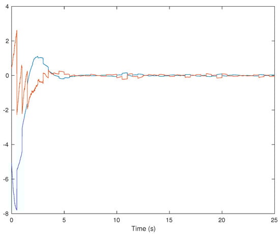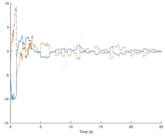 From Theorem 3, it appears that in order to construct the optimal -filter, one has to compute the stabilizing solution of the DTARE (68) which verifies the sign condition (76). The coefficients of DTARE (68) depend on the unique solution of the non-homogeneous Lyapunov-type algebraic Equation (51). Hence, in order to synthesize the optimal filter, one has first to solve Equations (51) and (68), respectively. In order to solve (51), we use the same method as the one described in []. Equation (68) being a standard DTARE, we use existing numerical solvers in MATLAB 2020b ©. More specifically, we use the function idare.