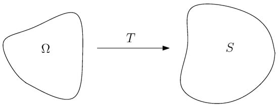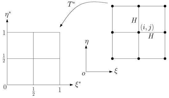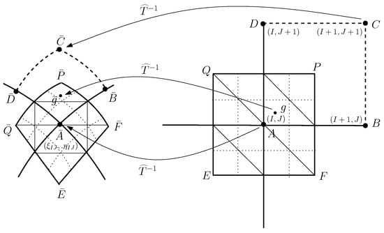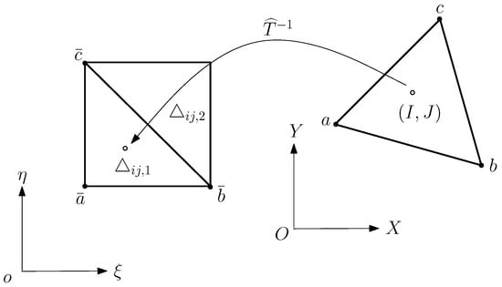 The values in (19)–(21) used in Technique I do not need to be exact, either, if their approximate values have small allowable errors. The nonlinear transformation T may also be approximated by a piecewise linear transformation on triangles , where in Figure 3. Hence, the values for can be evaluated approximately by those for . Note that the inverse transformation of is just a linear transformation locally. This avoids the nonlinear solutions in Algorithm SIM for T. The values and can be found using the following four steps.