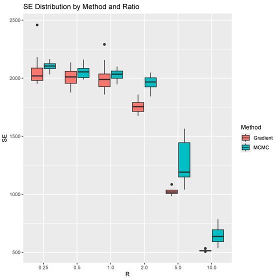 Side-by-side boxplots for the SE for each method and ratio. We repeat computation 10 times for each ratio and method.