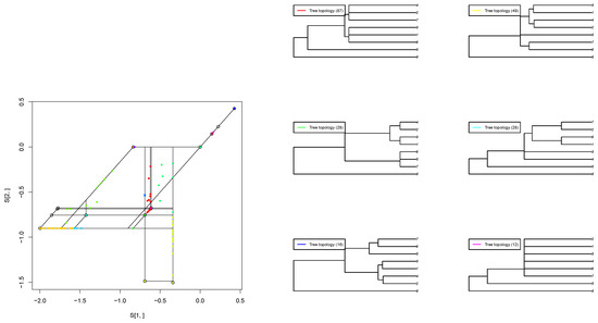 - Page, R.; Yoshida, R.; Zhang, L. Tropical principal component analysis on the space of phylogenetic trees. Bioinformatics 2020, 36, 4590–4598. [Google Scholar] [CrossRef] [PubMed]