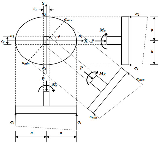 - Özmen, G. Determination of base stresses in rectangular footings under biaxial bending. Teknik Dergi Digest 2011, 22, 1519–1535. Available online: https://dergipark.org.tr/tr/download/article-file/136568 (accessed on 1 May 2025).